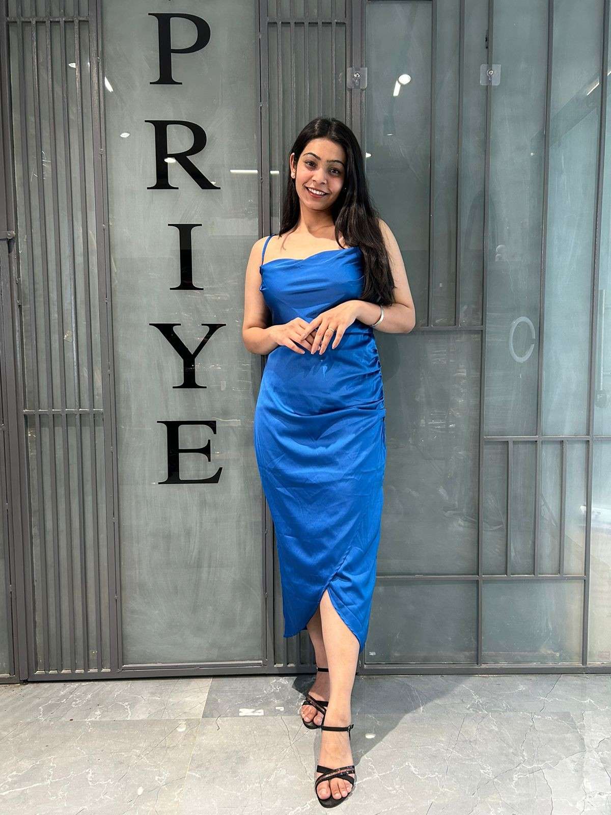 An elegant bodycon satin strap dress in a rich royal blue hue, designed to exude timeless sophistication. The smooth satin finish and sleek silhouette create a refined, effortlessly glamorous look—perfect for evenings, parties, and special occasions.