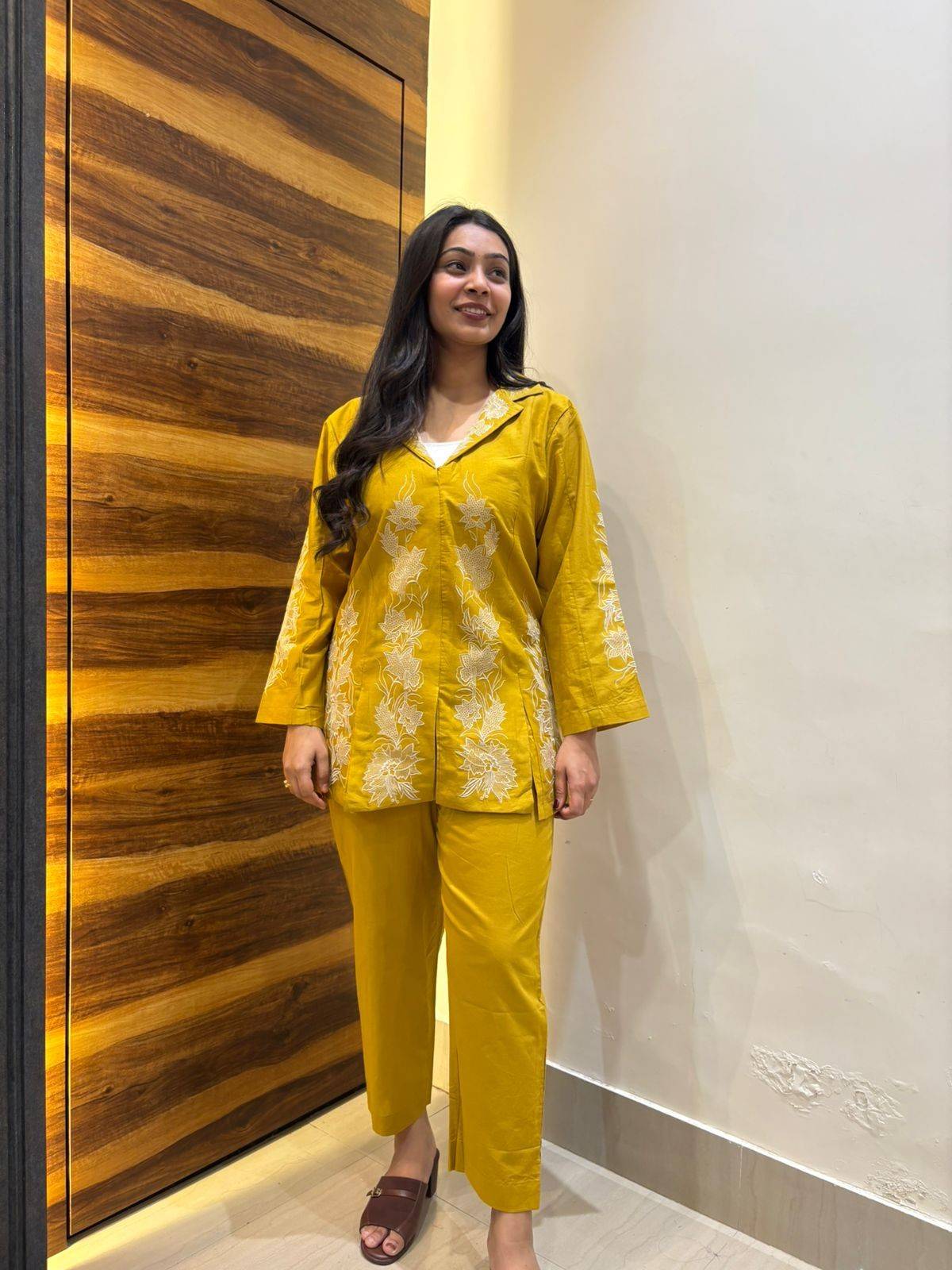 Fresh and feminine, this pure cotton coordset features delicate floral embroidery and a stylish detail that adds a chic twist. Perfect for casual outings, brunch dates, or day wear.