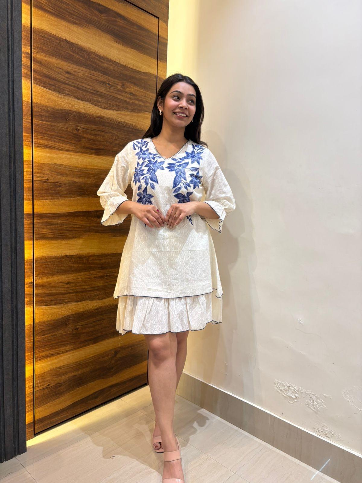 This cotton outfit features beautiful hand-painted floral patches paired with a soft downside frill pattern that adds a breezy, flowy charm to the look. Light, airy, and effortlessly stylish, it’s perfect for comfortable day wear with an artistic touch.