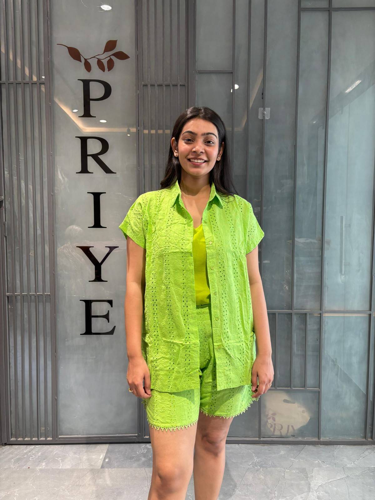 Embrace effortless elegance with this beautifully crafted cutwork cotton 3-piece shorts coord set, designed to bring together feminine detailing and everyday comfort. Made from lightweight, breathable 100% cotton, this set includes a delicately embroidered cutwork top, matching shorts, and a stylish coordinated overlay—such as a shrug, vest, or lightweight jacket—for a complete, elevated summer look.