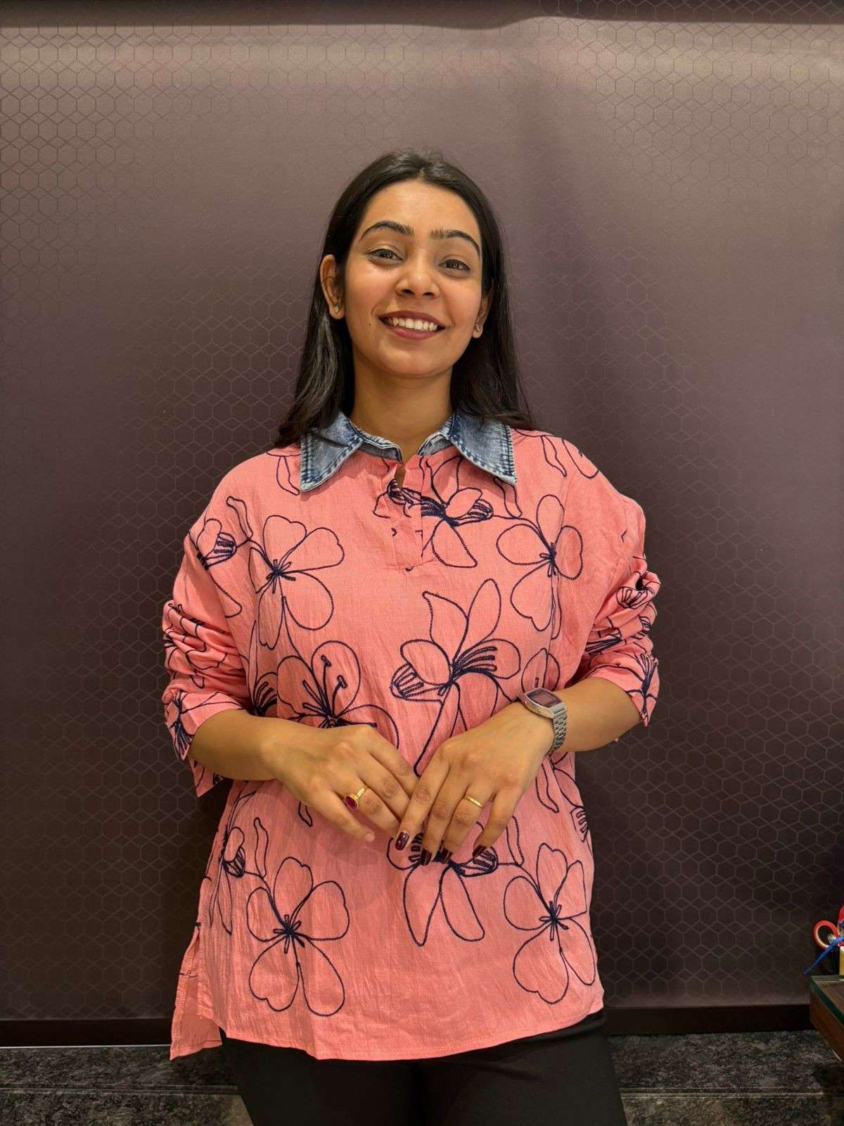A perfect blend of edgy and chic, this denim collar shirt features intricate embroidery that adds a touch of elegance to its laid-back vibe. Designed in a relaxed baggy fit with a stylish high-low hem, it offers both comfort and statement style. The structured denim collar contrasts beautifully with the soft fabric, making it a versatile piece for both casual and elevated looks. Pair it with denims, trousers, or skirts for an effortlessly cool outfit.