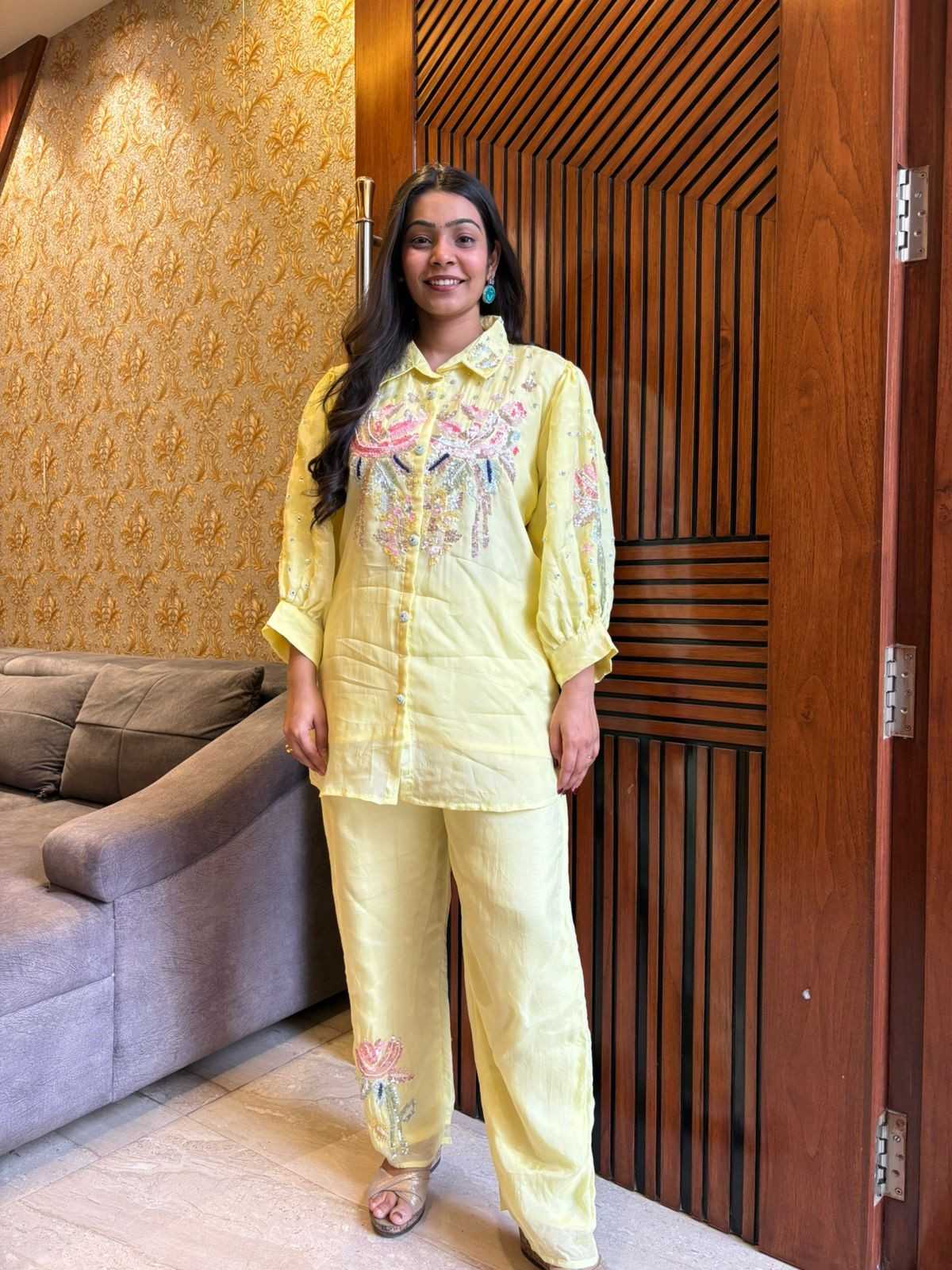 Is elegant pastel Organza coordset mein subtle shine ke saath rich Chidi sequence handwork ki detailing di gayi hai.