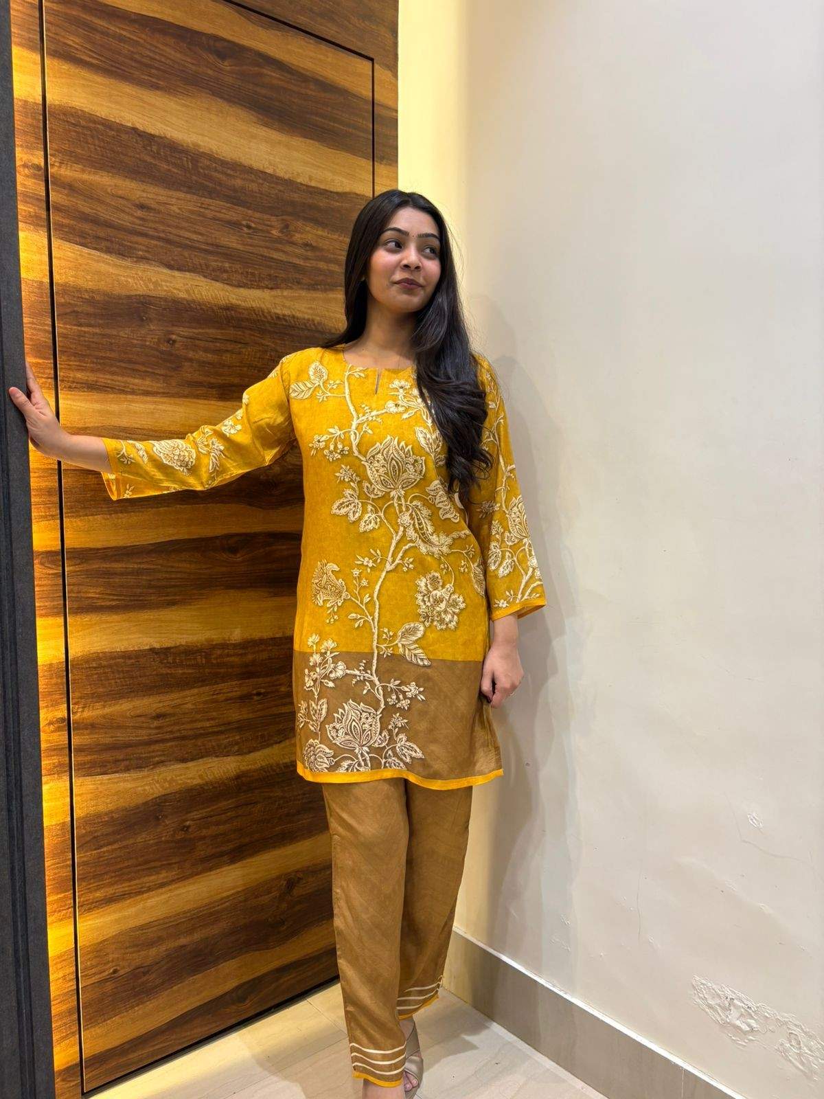 Elegant and graceful, this Gulmohar printed coord set is crafted in soft crepe silk with a beautiful flow and subtle sheen. The vibrant floral print adds a fresh, festive charm while keeping the look classy and lightweight. Perfect for day outings, small gatherings, or elegant casual wear ✨