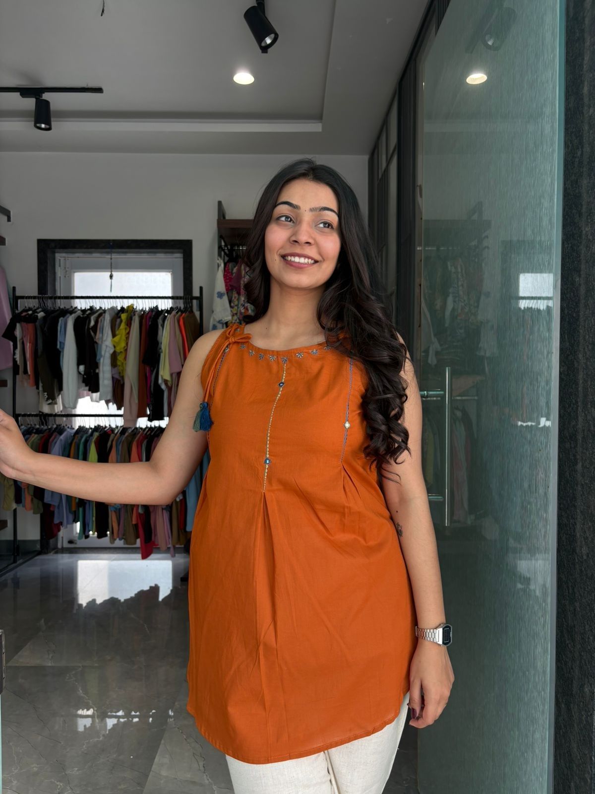 A breezy printed sleeveless tunic crafted in soft pure cotton, designed for effortless everyday elegance. The tassel detailing on the shoulder adds a playful touch, making it perfect for a chic yet comfortable look.